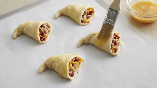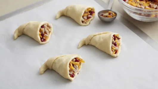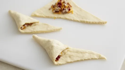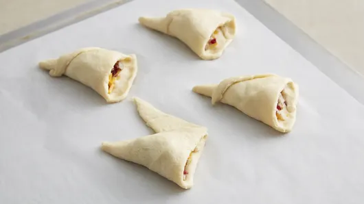 Step4Wrap remaining point around front of filled crescent on cookie sheet. Press bottom layer of opening of dough cone to lengthen slightly.