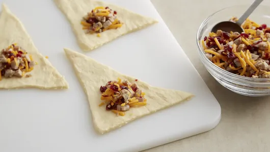 Step2Separate dough into 8 triangles. Slightly stretch shortest side of dough triangle. Gently press filling into tablespoon, and place at shortest side of triangle.