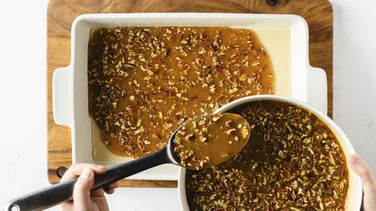 Cover the baking dish with plastic wrap or transfer leftovers to an airtight container, then store in the fridge for up to 3 days. We wouldn’t recommend freezing leftover pecan pie cobbler—it won’t hold together when you thaw it.