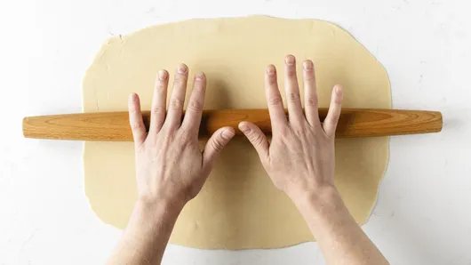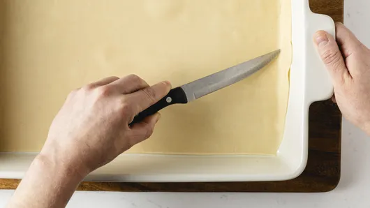 Roll out one pie crust and press it into a greased 13x9-inch pan. The pie crust will be pretty thin, so we recommend rolling it up on your rolling pin to easily transfer it to the dish.