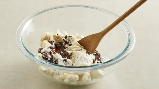 Step2In large bowl, break up cookie dough. Add cooled chocolate and flour; stir with spoon or hands until well blended. (DO NOT EAT RAW COOKIE DOUGH AFTER COMBINING WITH FLOUR.)