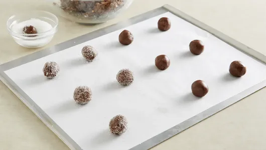 Step3Shape dough into 36 (1 1/4-inch) balls. Roll balls in sugar. Place balls 1 inch apart on ungreased cookie sheet.