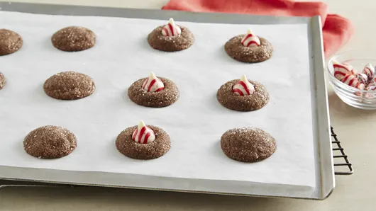 Step4Bake 7 to 9 minutes or until edges are set. Immediately top each cookie with 1 candy, pressing down firmly so cookie cracks around edges. Cool 2 minutes; remove from cookie sheets to cooling racks. Cool completely, about 30 minutes.