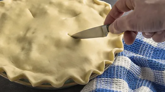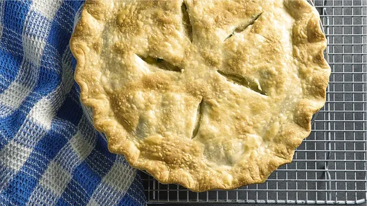 Spoon the filling into the bottom crust; top with the second crust. Flute your pie by folding the top crust edge under the bottom crust edge to create a thick raised edge. Then pinch the raised edge between your thumb and forefinger, creating a scalloped pattern. Don’t forget to slit the top crust to allow steam to escape.
