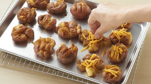 Step3In small bowl, mix olive oil with remaining 1 tablespoon taco seasoning mix. Brush tops of flattened potatoes with oil mixture. Bake 20 to 25 minutes or until golden brown and slightly crispy. Top potatoes with cheese; return to oven 1 to 2 minutes or until cheese is melted.