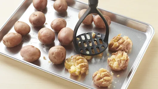 Step2In 4- to 5-quart saucepan, add potatoes and enough water to cover potatoes. Heat to boiling; cover. Reduce heat. Simmer 15 to 20 minutes or until tender; drain. Transfer potatoes onto pan. Using potato masher or bottom of glass, carefully smash each potato until slightly flattened.