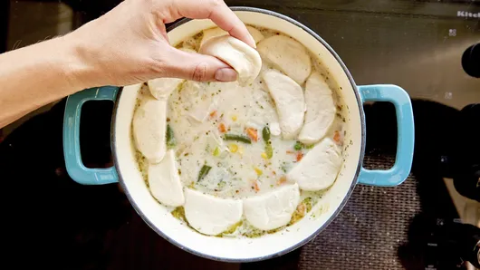 Reduce heat to low. Separate dough into 12 biscuits. Cut each biscuit in half. Starting around edges of saucepan, arrange biscuit halves on top of chicken mixture, overlapping slightly in spiral fashion. Cover; cook 20 to 25 minutes or until biscuits are fluffy and no longer doughy. Stir chicken mixture gently before serving.