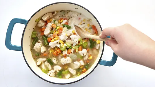 Add frozen mixed vegetables, broth, parsley, salt and poultry seasoning. Heat to boiling, stirring occasionally. In small bowl, stir milk and flour until smooth. Add to chicken mixture; bring to a boil.