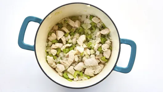 In 4-quart saucepan or Dutch oven, melt butter over medium-high heat. Add chicken, onions, celery and garlic; cook 6 to 8 minutes, stirring occasionally, until chicken is no longer pink.