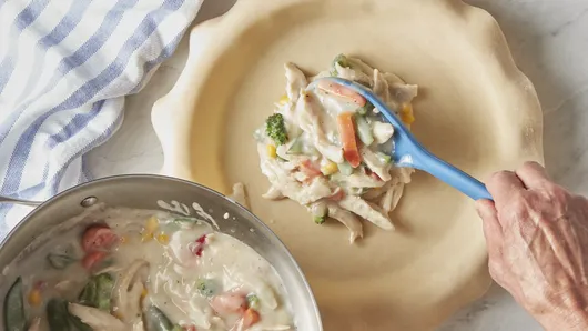 Our turkey pot pie recipe is easy enough for a weeknight dinner! Using leftover, tender turkey, it comes together quickly, with the help of frozen pie crusts. As with all pot pies, there are a few common steps you’ll want to know: