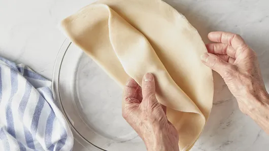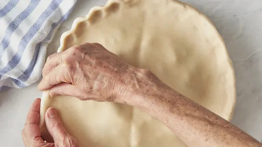 When making a two-crust pie, like this delicious turkey pot pie, it’s important to seal the bottom and top crusts together to encase all the scrumptious fillings inside. Fluting is one way to seal crusts together. Create a wavy detail by pinching the dough around your thumb and forefinger. But there are other options as well.