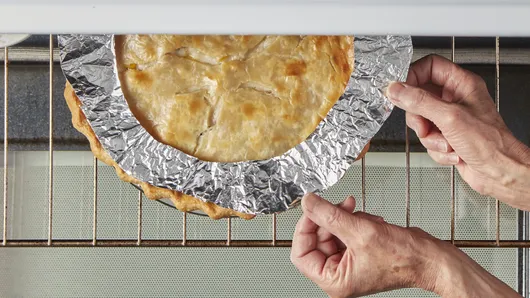 The pot pie is baked 20 minutes and then a strip of aluminum foil is added around the edge to prevent it from getting too brown. The pie continues to bake until the top is golden brown (and that means the filling inside is hot and the veggies are cooked.)