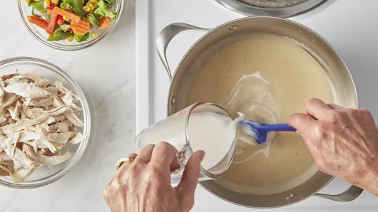 Just a few pantry staples make a quick, savory sauce to bring all those delicious veggies and bite-size pieces of turkey together. Chopped onion is cooked in salted butter, and then flour is added with salt and pepper. Stir themed in with a whisk to keep it smooth while cooking it to thicken the mixture. Chicken broth and milk are added to make it the perfect thickness and amount for the veggies and turkey. Who knew these simple ingredients could make such a tasty sauce?