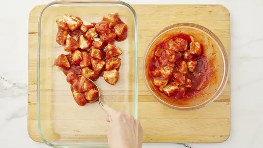 Step2Separate dough into 8 biscuits. Cut each into 6 pieces; place in medium bowl. Stir in pizza sauce to coat. Spoon biscuit mixture evenly into dish.