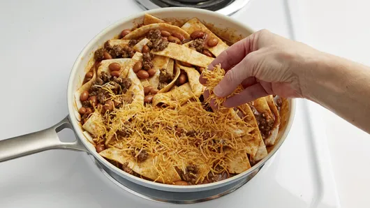 Step3Stir in tortilla strips; top with cheese. Cover skillet; set aside 3 to 4 minutes or until cheese is melted. Sprinkle with cilantro.