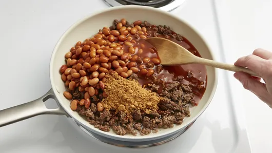 Step2Add taco seasoning mix, water, enchilada sauce and beans. Cook 3 to 5 minutes, stirring frequently, until sauce thickens. Remove from heat.