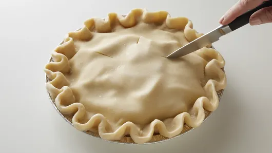 Step6When ready to bake pie, heat oven to 450°F. When oven is preheated, remove frozen pie from freezer; cut a few slits in top crust and place in oven. Do not thaw pie because no one wants a soggy pie.