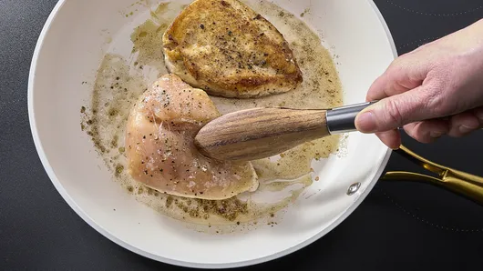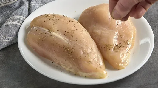 While the pasta is cooking, season your chicken breasts with salt and pepper; then, add them to the pan. Cook until the chicken is no longer pink in the middle. Transfer to a cutting board, and let rest while you make the sauce.