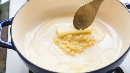 • Start the Sauce by Cooking the Garlic: In the same skillet the chicken was cooked in, melt the butter, and cook the garlic until fragrant.