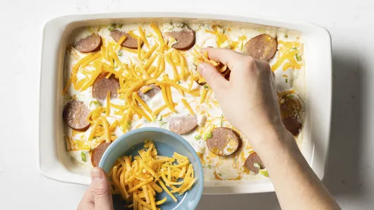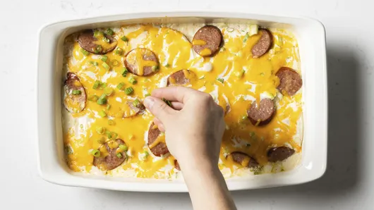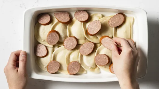 Layer pierogies evenly in baking dish, overlapping slightly. Top with sausage.