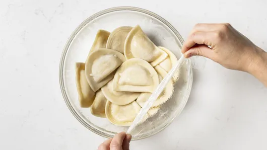 Place frozen pierogies and water in medium microwave-safe bowl; cover with plastic wrap. Microwave on High for 2 minutes; stir. Continue microwaving on High for 1 1/2 to 2 minutes until thawed.