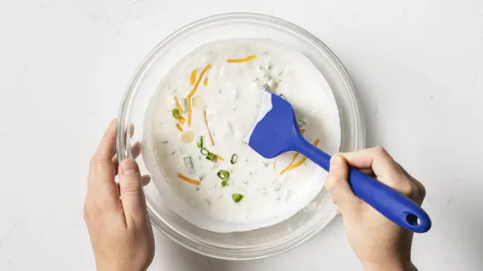 In medium bowl, whisk together cream cheese, sour cream, chicken broth, and pepper until smooth. Stir in 1/2 cup of the cheddar cheese and 1/3 cup of the green onions (reserve remaining onions for topping).
