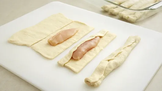 Step3Unroll 1 dough sheet; cut into 4 rectangles. Place 1 chicken tenderloin on one long side of each dough rectangle; roll up. Pinch edges and ends to seal. Place seam-side-down in baking dish. Repeat with remaining dough sheet and chicken tenderloins. Sprinkle with Parmesan mixture.
