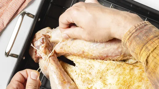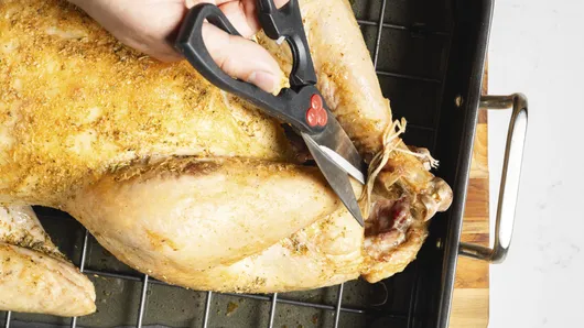 Remove twine holding legs to allow the inside of the thighs to cook thoroughly and evenly.