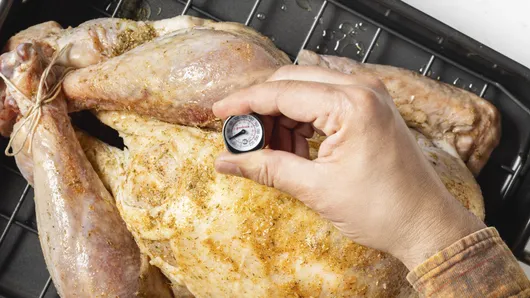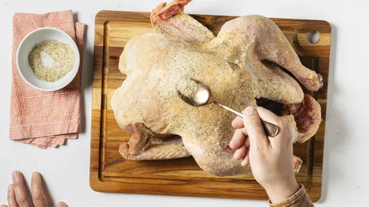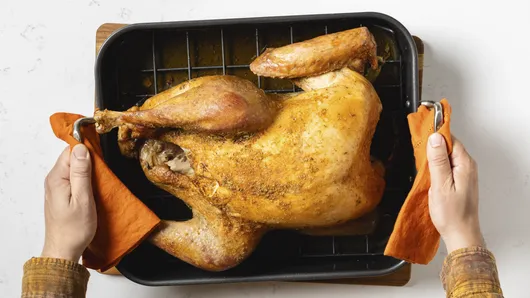 var configuration = {"title":"Best Roast Turkey","introduction":"\u003cp\u003eThis roast Thanksgiving turkey recipe keeps things simple but flavorful, with a buttery herb\u0026nbsp; and spice blend rubbed on top of the skin. The unique mix of oregano, rosemary, mustard, and coriander gives it a savory, tangy flavor boost that’s so different from other classic recipes. Perfect for any holiday meal or special occasion, this Thanksgiving turkey is a showstopping main dish that’s impressive, delicious, and surprisingly easy to make.\u003c/p\u003e","servingSize":"1 Serving","image":{"small":{"media":"(min-width: 0px)","src":"https://mojo.generalmills.com/api/public/content/s51vzH3qR2O3ONR-cXaMcA_webp_base.webp?v=a101176b\u0026t=e724eca7b3c24a8aaa6e089ed9e611fd"},"medium":{"media":"(min-width: 500px)","src":"https://mojo.generalmills.com/api/public/content/s51vzH3qR2O3ONR-cXaMcA_webp_base.webp?v=a101176b\u0026t=191ddcab8d1c415fa10fa00a14351227"},"large":{"media":"(min-width: 767px)","src":"https://mojo.generalmills.com/api/public/content/s51vzH3qR2O3ONR-cXaMcA_webp_base.webp?v=a101176b\u0026t=191ddcab8d1c415fa10fa00a14351227"},"alt":"Best Roast Turkey"},"contributor":{"label":"By","name":"Edited by Joanna","profileUrl":"/about-us/joanna","displayDate":{"label":"Updated","date":"Aug 29, 2025"}},"ingredientGroups":[{"ingredients":[{"quantity":"1","description":"whole turkey (18 lb), thawed if frozen"},{"quantity":"1/4","description":"cup unsalted butter, softened"},{"quantity":"1","description":"tablespoon garlic salt"},{"quantity":"1","description":"tablespoon dried oregano leaves"},{"quantity":"1","description":"tablespoon dried rosemary leaves, crushed"},{"quantity":"1 1/2","description":"teaspoons ground mustard"},{"quantity":"1","description":"teaspoon ground coriander"},{"quantity":"1/2","description":"teaspoon ground red pepper (cayenne)"},{"quantity":"","description":"Salt and pepper to taste"},{"quantity":"2","description":"tablespoons olive oil"}]}],"steps":[{"description":"\u003cp\u003eMove oven rack to lowest position. Heat oven to 325°F.\u003c/p\u003e"},{"description":"\u003cp\u003eDiscard giblets and neck from turkey or reserve for another use. Using fingers, gently loosen skin covering turkey breast and thighs; spread butter evenly under skin.\u003c/p\u003e","stepShotImageUrl":"//mojo.generalmills.com/api/public/content/WX-cASpMQFWdqTH67k6CzA_webp_base.webp?v=f734f475\u0026t=51a43a57af4046789e5a7f20567b1195"},{"description":"\u003cp\u003eIn small bowl, combine garlic salt, oregano, rosemary, mustard, coriander, red pepper, salt, and pepper. Rub spice mixture over turkey skin.\u003c/p\u003e","stepShotImageUrl":"//mojo.generalmills.com/api/public/content/XhootmA5Raupi1ORl1jTkg_webp_base.webp?v=13fe437c\u0026t=51a43a57af4046789e5a7f20567b1195"},{"description":"\u003cp\u003eFold wings across back of turkey so tips are touching.\u003c/p\u003e","stepShotImageUrl":"//mojo.generalmills.com/api/public/content/HX4C8L2BRF--TVGdTGdL_g_webp_base.webp?v=cc89ac49\u0026t=51a43a57af4046789e5a7f20567b1195"},{"description":"\u003cp\u003ePlace turkey, breast side up, on rack in shallow roasting pan. Drizzle oil over turkey.\u003c/p\u003e","stepShotImageUrl":"//mojo.generalmills.com/api/public/content/J_T_pRwGRHaD0N4pzDKUaw_webp_base.webp?v=88fbedb1\u0026t=51a43a57af4046789e5a7f20567b1195"},{"description":"\u003cp\u003eTie legs together with butcher’s twine.\u003c/p\u003e","stepShotImageUrl":"//mojo.generalmills.com/api/public/content/aOIiabLSTkSpjLw8XEXJ7A_webp_base.webp?v=e9102e08\u0026t=51a43a57af4046789e5a7f20567b1195"},{"description":"\u003cp\u003eInsert ovenproof meat thermometer so tip is in thickest part of inside thigh muscle and does not touch bone. Do not add water to pan. Roast uncovered 2 hours.\u003c/p\u003e","stepShotImageUrl":"//mojo.generalmills.com/api/public/content/nmk0JwNoRYO0qOtcCBruog_webp_base.webp?v=49bc76ed\u0026t=51a43a57af4046789e5a7f20567b1195"},{"description":"\u003cp\u003eRemove twine holding legs to allow the inside of the thighs to cook thoroughly and evenly.\u003c/p\u003e","stepShotImageUrl":"//mojo.generalmills.com/api/public/content/2-elMi7_QN6sjmf0uS7vmw_webp_base.webp?v=69d75020\u0026t=51a43a57af4046789e5a7f20567b1195"},{"description":"\u003cp\u003eRoast 2 hours 15 minutes to 2 hours 45 minutes longer, or until the thermometer reads 165°F and legs move easily when lifted or twisted (cover loosely with foil if necessary to prevent overbrowning). Remove turkey from oven; let stand 15 minutes before carving.\u003c/p\u003e","stepShotImageUrl":"//mojo.generalmills.com/api/public/content/Bw_NLuenQCiBBxf2NsDB7g_webp_base.webp?v=c6b520a5\u0026t=51a43a57af4046789e5a7f20567b1195"}],"tips":[{"title":"","description":"Easy recipe for the best Thanksgiving turkey ever! Made with a unique spice blend, it’s crispy, moist, flavorful, and perfect for the holidays.","category":"Rich Snippet","tipShots":[]},{"title":"","description":"\u003cp\u003eDon’t wait until the last minute to buy your Thanksgiving turkey! If you’re planning on ordering a fresh turkey, it’s best to do this at least a week ahead so you can pick it up a day or two before cooking. If you’re using a frozen turkey, make sure you leave enough time for it to thaw properly in the fridge—a general rule for how long to thaw a turkey is to allow 24 hours of thawing time for every 4 to 5 pounds of turkey.\u003c/p\u003e","category":"Method Note","tipShots":[]},{"title":"","description":"\u003cp\u003eWe ALWAYS recommend thawing a frozen turkey in the refrigerator, for a max of 4 to 5 days. Keep the turkey in its store packaging for defrosting—the wrapping it comes in is designed to keep bacteria out and freshness in—and place it in a pan or on a rimmed baking sheet to catch any liquid that might leak out during thawing.\u0026nbsp;\u003c/p\u003e","category":"Method Note","tipShots":[]},{"title":"","description":"\u003cp\u003eDrying the surface of your turkey is critical to getting a nice crispy skin du