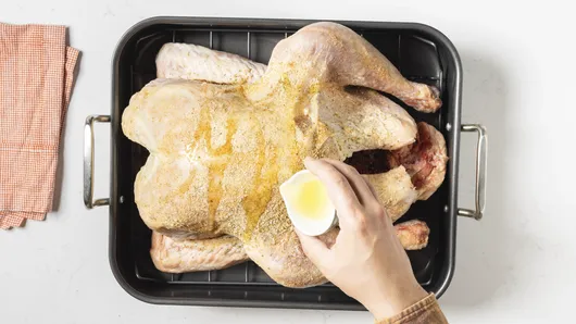 Place turkey, breast side up, on rack in shallow roasting pan. Drizzle oil over turkey.