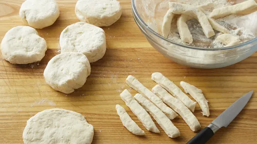 Separate dough into 8 biscuits; sprinkle with flour until biscuits are evenly coated. Roll or pat each biscuit to 1/8 inch thick; cut into 1/2-inch-wide strips, tossing with flour as you go. Drop strips, one at a time, into hot turkey mixture.