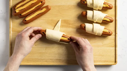 Cut slits in hot dogs, and insert strips of cheese into each one. There’s no need to cook hot dogs beforehand since they’re fully cooked when purchased and will heat through as the dough bakes in the oven. Keeping them cold makes wrapping the dough easier, too.