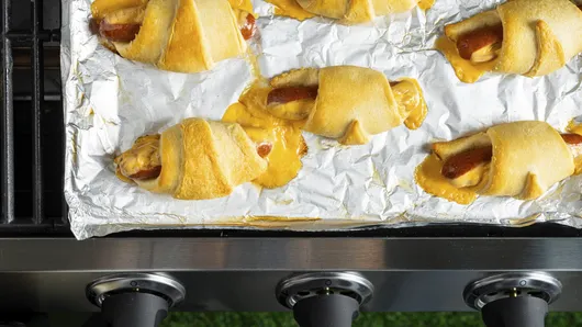 Bring the cookie sheet near the grill grates, and carefully slide foil with crescent dogs onto the grates. Cover the grill, and check at minimum cook time for doneness as grill temperatures may vary. Let them cool a little before serving.