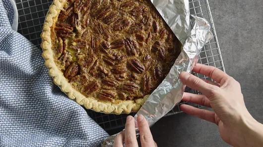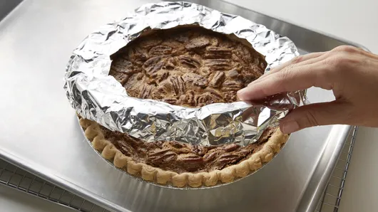 To ensure your pecan pie recipe sets properly without burning the top, cover the edge of the crust with strips of aluminum foil to prevent overbaking. If the top starts to brown too quickly, loosely cover the entire pie with foil, and continue baking until the filling is set. Be careful not to overbake as the top may crack. If it does, a generous dollop of whipped cream is a simple way to cover it up.