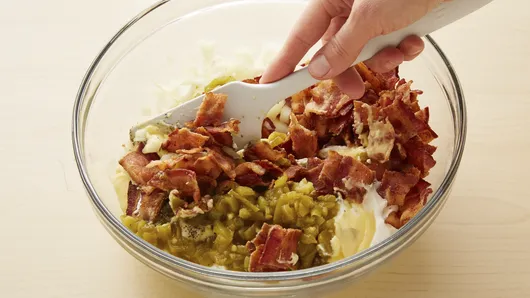 Step2In large bowl, mix bacon, onion, sour cream, condensed soup, green chiles, salt and pepper; mix well.