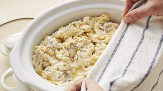 Step4Cover insert with large kitchen towel. Place slow-cooker lid on top of towel. (This will prevent condensation from dripping onto hash browns during cooking.)