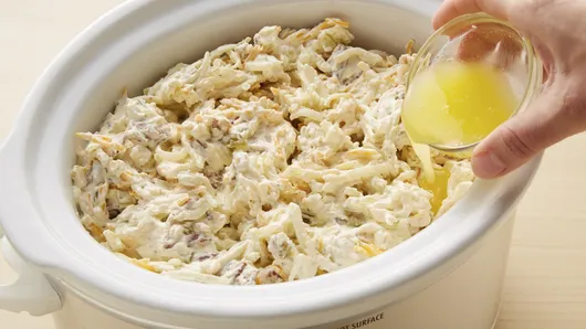 Step3Carefully stir in hash browns and cheese; mix well. Transfer mixture to slow cooker, and drizzle with melted butter.