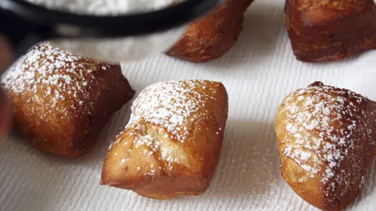 - Basically a fancy name for a doughnut, beignets are pillowy-soft pieces of fried pastry dough covered in powdered sugar (the name literally translates from French to “fritter”). The official state doughnut of Louisiana, beignets were brought there by French settlers who migrated down from Canada. Nowadays, they are one of the most famous foods to try in the French Quarter of New Orleans, typically served with a small mug of café au lait. When we can’t make it down to New Orleans for some authentic beignets, we turn to this no-fail recipe. Traditional homemade beignets require lots of flour, active yeast, shortening and a handful of other ingredients, but our shortcut version needs just three! Plus, they’re ready to eat in just 20 minutes (lucky you!). If you haven’t figured it out already (where have you been?!), we’ve got easy dessert shortcuts for just about every other sweet treat out there, too.