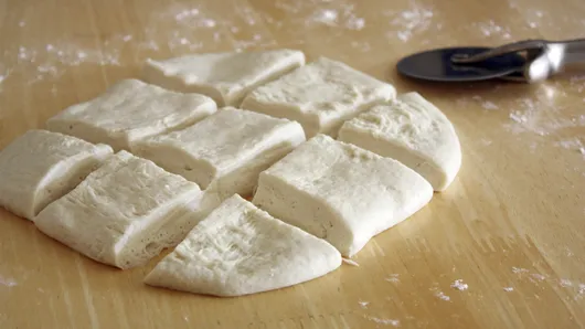 Step3On lightly floured work surface, roll dough into ball and pat into 8x6-inch rectangle about 1/2 inch thick. Cut into 9 equal pieces using pizza cutter or knife.