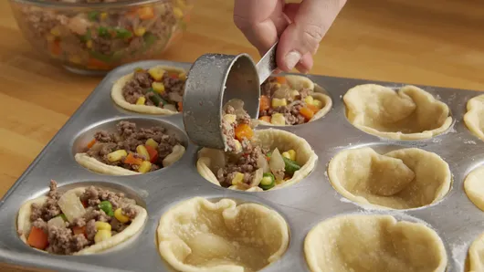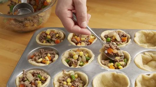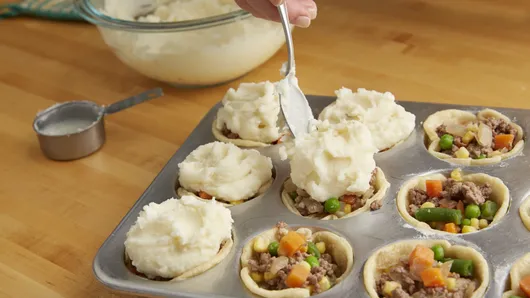 var configuration = {"title":"Mini Shepherd\u0027s Pot Pies","introduction":"Traditional shepherd’s pie gets a mini makeover in this easy muffin tin recipe. The best part? You can prepare these pies ahead of time and freeze for a later date—perfect to stash away for busy weeknights when you need to get dinner on the table fast.","servingSize":"1 Pot Pie","image":{"small":{"media":"(min-width: 0px)","src":"https://mojo.generalmills.com/api/public/content/8hKkGJp420eOT4IenlL2XQ_webp_base.webp?v=c1da4c5b\u0026t=e724eca7b3c24a8aaa6e089ed9e611fd"},"medium":{"media":"(min-width: 500px)","src":"https://mojo.generalmills.com/api/public/content/8hKkGJp420eOT4IenlL2XQ_webp_base.webp?v=c1da4c5b\u0026t=191ddcab8d1c415fa10fa00a14351227"},"large":{"media":"(min-width: 767px)","src":"https://mojo.generalmills.com/api/public/content/8hKkGJp420eOT4IenlL2XQ_webp_base.webp?v=c1da4c5b\u0026t=191ddcab8d1c415fa10fa00a14351227"},"alt":"Mini Shepherd\u0027s Pot Pies"},"contributor":{"label":"By","name":"Pillsbury Kitchens","profileUrl":"/about-us","displayDate":{"label":"Updated","date":"Feb 13, 2018"}},"ingredientGroups":[{"ingredients":[{"quantity":"1","description":"box (14.1 oz) refrigerated Pillsbury™ Pie Crusts (2 Count), softened as directed on box","productLink":"/products/pie-crust/refrigerated-pie-crust"},{"quantity":"1/2","description":"lb lean (at least 80%) ground beef "},{"quantity":"1","description":"small onion, chopped (1/2 cup)"},{"quantity":"4","description":"teaspoons all-purpose flour"},{"quantity":"3/4","description":"cup Progresso™ beef flavored broth (from 32-oz carton)"},{"quantity":"1/2","description":"teaspoon salt "},{"quantity":"1/8","description":"teaspoon pepper "},{"quantity":"1 1/2","description":"cups frozen mixed vegetables"},{"quantity":"1","description":"package (24 oz) refrigerated mashed potatoes (about 3 cups)"}]}],"steps":[{"description":"Heat oven to 375°F. Unroll pie crusts. On lightly floured surface, roll or press each crust to 12 inches diameter. Using 4-inch round cutter, cut 6 rounds from each crust.","stepShotImageUrl":"//mojo.generalmills.com/api/public/content/FGC5-MZOdESQunDEI9Tkqg_webp_base.webp?v=63494d27\u0026t=51a43a57af4046789e5a7f20567b1195"},{"description":"Gently press rounds floured-side-down in bottoms and up sides of 12 ungreased regular-size muffin cups. Bake 9 to 11 minutes or until lightly browned.","stepShotImageUrl":"//mojo.generalmills.com/api/public/content/cMAJwCppFUqLhYrORrmp3A_webp_base.webp?v=35319911\u0026t=51a43a57af4046789e5a7f20567b1195"},{"description":"Meanwhile, in 12-inch nonstick skillet, cook beef and onion over medium-high heat, stirring frequently, about 5 minutes or until beef is thoroughly cooked; drain. Stir in flour until blended. Add broth, salt and pepper. Cook about 2 minutes or until mixture thickens. Stir in frozen mixed vegetables. Fill each muffin cup with about 1/4 cup beef mixture.","stepShotImageUrl":"//mojo.generalmills.com/api/public/content/JXgYKxchyEmfF119O14lHw_webp_base.webp?v=eaea2d0a\u0026t=51a43a57af4046789e5a7f20567b1195"},{"description":"Top each with slightly less than 2 tablespoons potatoes. Bake 20 to 25 minutes or until potatoes are lightly browned.","stepShotImageUrl":"//mojo.generalmills.com/api/public/content/DbJoKXUUjkuHWfkV0eqdeg_webp_base.webp?v=b0e1c383\u0026t=51a43a57af4046789e5a7f20567b1195"},{"description":"To freeze: After placing pies in muffin cups, wrap muffin pan in foil, and freeze completely. Transfer frozen pies to labeled gallon-size resealable freezer bag. To bake: Heat oven to 375°F. Remove desired number of pies from bag, and place in sprayed muffin cups or ramekins on cookie sheet. Loosely tent with foil that has been sprayed with cooking spray; bake 20 minutes. Remove foil, and bake 8 to 10 minutes longer or until instant-read thermometer inserted in center reads 165°F.","stepShotImageUrl":"//mojo.generalmills.com/api/public/content/JYXQxeagx0u5ox2fitWwyQ_webp_base.webp?v=d3a38150\u0026t=51a43a57af4046789e5a7f20567b1195"}],"tips":[{"title":"","description":"Make your own mashed potatoes using instant mashed potatoes. ","category":"Substitution","tipShots":[]},{"title":"","description":"If you don’t have a 4-inch round cutter, find a small plate you can cut around using a small knife.","category":"Techniques","tipShots":[]},{"title":"","description":"Sprinkle with chopped parsley after baking.","category":"Presentation/Garnish","tipShots":[]},{"title":"","description":"Recipe meets Kitchen Tested criteria. Reviewed as part of SEO improvements Oct. 2019.","category":"Kitchen Tested","tipShots":[]}],"kitchenTips":[{"title":"","description":"Make your own mashed potatoes using instant mashed potatoes. ","category":"Substitution","tipShots":[]},{"title":"","description":"If you don’t have a 4-inch round cutter, find a small plate you can cut around using a small knife.","category":"Techniques","tipShots":[]},{"title":"","description":"Sprinkle with chopped parsley after baking.","category":"Presentation/Garnish","tipShots":[]}],"additionalContent":[],"faq":[],"tipCategories":[{"categoryName":"Kitchen Tested","heading":"More About This Recipe","cssClass":"recipePartStory","expandOnInit":false,"expandText":"More +","collapseText":"Less -","expandEventName":"","collapseEventName":"","image":"","tips":[{"title":"","description":"Recipe meets Kitchen Tested criteria. Reviewed as part of SEO improvements Oct. 2019.","category":"Kitchen Tested","tipShots":[]}],"isExpandable":false}],"nutritionInfo":{"configuration":{"showAsTable":false,"noNutritionInformationAvailableMessage":"No nutrition information available for this recipe","poweredByText":"\u003cp\u003eNutrition information for this recipe is estimated using a leading nutrition calculation application, but is an estimate only. Actual nutrition values will vary based on the exact ingredients or brands you may use.\u003c/p\u003e\n\u003ca href=\u0022http://developer.edamam.com\u0022\u003ePowered By \u003cimg src=\u0022-