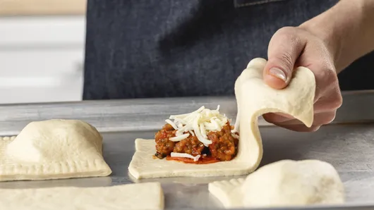 This is designed as an easy variation on a calzone recipe, so it sticks with the classics, but that’s by no means the end of the story. Spicy sausage and sliced pepperoni are the toppings listed, but you can add olives, mushrooms, peppers, onions—any of your favorite pizza toppings. Or try mixing in some Parmesan, asiago or smoked gouda in with the recommended mozzarella cheese. Feel free to pile it on, just don’t overstuff it! You still want it to be able to seal the dough.