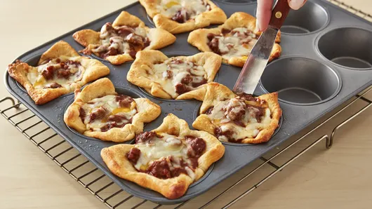Step3Bake 14 to 16 minutes or until dough is deep golden brown and filling is heated through. Cool in pan 5 minutes; using metal spatula, run around edge of each muffin cup to remove from pan.