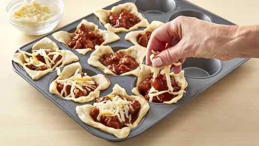 Step2On large cutting board, unroll dough (if using crescent dough, press perforations to seal); cut into 8 squares with sharp knife or pizza cutter. Line each muffin cup by pressing 1 dough square in bottom and up side of cup. Divide beef mixture evenly among dough-lined cups, about 1/4 cup each. Top cups with cheese, about 1 tablespoon each.