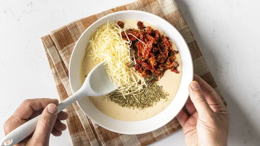 Drain the oil from the jar of sun-dried tomatoes (otherwise your sauce will turn out too oily). Mix together Alfredo sauce, sun-dried tomatoes, Parmesan, and Italian seasoning. Then, pour the sauce over the chicken. During recipe testing, we found that it only takes 2 to 3 hours in the slow cooker to cook the chicken perfectly without drying it out. Any longer than that, and the sauce may start to separate.