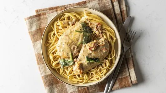 var configuration = {"title":"Slow-Cooker Creamy Tuscan Chicken","introduction":"\u003cp\u003eLet your slow cooker handle dinner with this rich, flavorful, and creamy Tuscan chicken. Made with tender chicken breasts, roasted garlic Alfredo sauce, sun-dried tomatoes, and fresh spinach, it’s a warm, satisfying meal that comes together with only 15 minutes of prep time. It’s perfect for busy weekdays, cozy Sunday dinners, or anytime you want to impress without spending hours in the kitchen. Served with rice or your favorite pasta, this dish is a guaranteed crowd-pleaser, and the leftovers reheat like a dream.\u003c/p\u003e","servingSize":" 1/4 of Recipe","image":{"small":{"media":"(min-width: 0px)","src":"https://mojo.generalmills.com/api/public/content/wHtMIqCARsmFO5hjW-GTdg_webp_base.webp?v=557b5146\u0026t=e724eca7b3c24a8aaa6e089ed9e611fd"},"medium":{"media":"(min-width: 500px)","src":"https://mojo.generalmills.com/api/public/content/wHtMIqCARsmFO5hjW-GTdg_webp_base.webp?v=557b5146\u0026t=191ddcab8d1c415fa10fa00a14351227"},"large":{"media":"(min-width: 767px)","src":"https://mojo.generalmills.com/api/public/content/wHtMIqCARsmFO5hjW-GTdg_webp_base.webp?v=557b5146\u0026t=191ddcab8d1c415fa10fa00a14351227"},"alt":"Slow-Cooker Creamy Tuscan Chicken"},"contributor":{"label":"By","name":"Edited by Joanna","profileUrl":"/about-us/joanna","displayDate":{"label":"Updated","date":"Aug 14, 2025"}},"ingredientGroups":[{"ingredients":[{"quantity":"1","description":"tablespoon butter"},{"quantity":"1","description":"package (20 oz) boneless skinless chicken breasts"},{"quantity":"1","description":"jar (15 oz) Alfredo pasta sauce with roasted garlic"},{"quantity":"1","description":"jar (7 oz) sundried tomato strips, cut into thin strips (about 1/2 cup)"},{"quantity":"1/4","description":"cup grated Parmesan cheese"},{"quantity":"1","description":"teaspoon Italian seasoning"},{"quantity":"1","description":"cup chopped fresh spinach"},{"quantity":"","description":"Hot cooked linguine or rice, if desired"}]}],"steps":[{"description":"\u003cp\u003eIn 12-inch nonstick skillet, melt butter over medium-high heat.\u003c/p\u003e","stepShotImageUrl":"//mojo.generalmills.com/api/public/content/8RRkYRCKQHS0QaF2zjH-SA_webp_base.webp?v=6755cd28\u0026t=51a43a57af4046789e5a7f20567b1195"},{"description":"\u003cp\u003eAdd chicken breasts; cook 3 to 5 minutes, turning once, until browned.\u003c/p\u003e","stepShotImageUrl":"//mojo.generalmills.com/api/public/content/_uyuisz_R_C3aqx4AfOv9g_webp_base.webp?v=a82b1438\u0026t=51a43a57af4046789e5a7f20567b1195"},{"description":"\u003cp\u003eIn 3 1/2- to 4-quart slow cooker, place chicken breasts.\u003c/p\u003e","stepShotImageUrl":"//mojo.generalmills.com/api/public/content/wgWTG7JWT_ukshFeeW1lPQ_webp_base.webp?v=3fa195e8\u0026t=51a43a57af4046789e5a7f20567b1195"},{"description":"\u003cp\u003eIn medium bowl, mix Alfredo sauce, sun-dried tomatoes, Parmesan cheese, and Italian seasoning until well mixed. Pour over chicken breasts.\u003c/p\u003e","stepShotImageUrl":"//mojo.generalmills.com/api/public/content/DVBz1VCuTrKVUIB295gZAg_webp_base.webp?v=5801f013\u0026t=51a43a57af4046789e5a7f20567b1195"},{"description":"\u003cp\u003eCover; cook on Low heat setting 2 to 3 hours or until chicken is no longer pink in center (165°F).\u003c/p\u003e","stepShotImageUrl":"//mojo.generalmills.com/api/public/content/J-v9U-5vRkCuIj17-hW1bg_webp_base.webp?v=8975d6d7\u0026t=51a43a57af4046789e5a7f20567b1195"},{"description":"\u003cp\u003eStir in spinach; cook 5 minutes longer.\u003c/p\u003e","stepShotImageUrl":"//mojo.generalmills.com/api/public/content/-ebG0jGWRM2jxd8VQNkCKQ_webp_base.webp?v=ecd43eed\u0026t=51a43a57af4046789e5a7f20567b1195"},{"description":"\u003cp\u003eServe over linguine or rice, if desired.\u003c/p\u003e","stepShotImageUrl":"//mojo.generalmills.com/api/public/content/nkPQAKGxRreM4MECMFMdWA_webp_base.webp?v=62b97f51\u0026t=51a43a57af4046789e5a7f20567b1195"}],"tips":[{"title":"","description":"Slow-Cooker Creamy Tuscan Chicken is an easy weeknight dinner made with Alfredo sauce, spinach, and sun-dried tomatoes. Great served with pasta or rice.","category":"Rich Snippet","tipShots":[]},{"title":"","description":"\u003cp\u003eWe’ve seen several comments that home cooks have added extra spinach, sauteed onions, and mushrooms to this recipe. We think those are all great ideas! You could also substitute arugula or kale for the spinach.\u003c/p\u003e","category":"Variation","tipShots":[]},{"title":"","description":"\u003cp\u003ePlain Alfredo sauce will work just fine for this recipe, too. You can add about 1/2 teaspoon garlic powder to the sauce, or omit it completely if you’re not a fan of garlic. This dish will still be super delicious!\u003c/p\u003e","category":"Substitution","tipShots":[]},{"title":"TIP FROM THE Doughboy","description":"\u003cp\u003eLeftover creamy Tuscan chicken makes great lunches during the week!\u003c/p\u003e","category":"Pillsbury Highlight","tipShots":[]},{"title":"","description":"Kitchen Tested - 11/2016.","category":"Kitchen Tested","tipShots":[]}],"kitchenTips":[{"title":"","description":"\u003cp\u003eWe’ve seen several comments that home cooks have added extra spinach, sauteed onions, and mushrooms to this recipe. We think those are all great ideas! You could also substitute arugula or kale for the spinach.\u003c/p\u003e","category":"Variation","tipShots":[]},{"title":"","description":"\u003cp\u003ePlain Alfredo sauce will work just fine for this recipe, too. You can add about 1/2 teaspoon garlic powder to the sauce, or omit it completely if you’re not a fan of garlic. This dish will still be super delicious!\u003c/p\u003e","category":"Substitution","tipShots":[]}],"additionalContent":[{"title":"Recipe Ingredients","description":"\u003cp\u003eHere’s what you’ll need to bring this creamy, cozy chicken dinner together.\u003c/p\u003e\u003cp\u003e\u003cstrong\u003eChicken Breasts: \u003c/strong\u003eThese are easy to find in stores, easy to prep, an