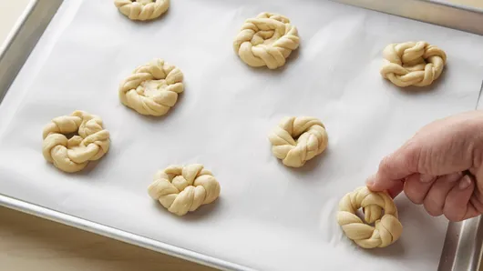 Step4Wrap short tail of dough around edge of loop, and tuck through center, pinching to secure, creating pumpkin-shaped roll. Place onto cookie sheet, and gently press dough together in center to touch. Repeat for remaining dough.