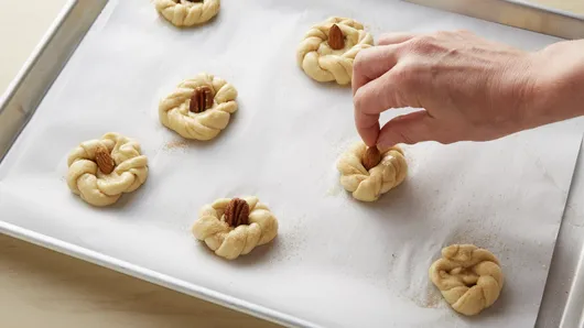 Step5Brush tops of dough rolls with melted butter, and sprinkle with sugar-cinnamon mixture. Insert almond into center of each roll (into dough) to create stem. Bake 12 to 15 minutes or until golden brown and dough is baked through. Serve warm rolls with cinnamon-sugar butter.
