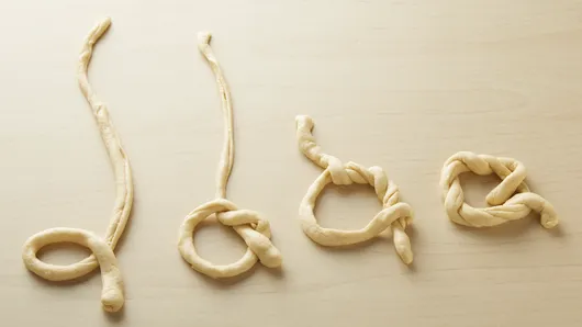 Step3Working with one strip at a time, roll slightly into 12-inch rope. Make small loop on one end, creating short tail and long tail of dough. Wrap long tail of dough around loop 2 to 3 times.