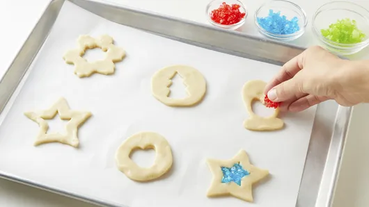 var configuration = {"title":"Easy Stained Glass Holiday Cookies","introduction":"Kids will have so much fun making these stained glass sugar cookies that resemble decorative stained glass windows! Whether you use this stained glass cookie recipe for a holiday party or cookie exchange—or just hang the cookies on your tree as festive ornaments—these easy Christmas stained glass cookies are sure to impress.","servingSize":"1 Large and 1 small cookie","image":{"small":{"media":"(min-width: 0px)","src":"https://mojo.generalmills.com/api/public/content/O0J2EjWjk0Wf8BmeSRzyhA_webp_base.webp?v=32173c20\u0026t=e724eca7b3c24a8aaa6e089ed9e611fd"},"medium":{"media":"(min-width: 500px)","src":"https://mojo.generalmills.com/api/public/content/O0J2EjWjk0Wf8BmeSRzyhA_webp_base.webp?v=32173c20\u0026t=191ddcab8d1c415fa10fa00a14351227"},"large":{"media":"(min-width: 767px)","src":"https://mojo.generalmills.com/api/public/content/O0J2EjWjk0Wf8BmeSRzyhA_webp_base.webp?v=32173c20\u0026t=191ddcab8d1c415fa10fa00a14351227"},"alt":"Easy Stained Glass Holiday Cookies"},"contributor":{"label":"By","name":"Pillsbury Kitchens","profileUrl":"/about-us","displayDate":{"label":"Updated","date":"Nov 15, 2022"}},"ingredientGroups":[{"ingredients":[{"quantity":"10","description":"pieces clear hard fruit candies, unwrapped"},{"quantity":"1","description":"roll (16.5 oz) refrigerated Pillsbury™ Sugar Cookie Dough","productLink":"/products/cookies/refrigerated-cookies/sugar-cookies"},{"quantity":"1/4","description":"cup all-purpose flour"}]}],"steps":[{"description":"Heat oven to 350°F. Line cookie sheets with cooking parchment paper. Place 2 to 3 candies of the same color in small plastic bag; seal bag. With hammer or flat side of meat mallet, gently pound to crush candy. Repeat with remaining candies, using several different colors."},{"description":"In large bowl, break up cookie dough. Mix in flour with spoon or hands, until well blended. (DO NOT EAT RAW COOKIE DOUGH AFTER COMBINING WITH FLOUR.) On lightly floured work surface, roll dough 1/8 inch thick, using additional flour as needed to prevent sticking. Cut out dough with floured 3-inch cookie cutter. With smaller cookie cutter (1 1/4 to 1 1/2 inches), cut out center of cookie. ","stepShotImageUrl":"//mojo.generalmills.com/api/public/content/yjmhtwAXRkKp_xhKyydzLg_webp_base.webp?v=18feb538\u0026t=51a43a57af4046789e5a7f20567b1195"},{"description":"Place large cutouts 2 inches apart on cookie sheet. Place 1/4 to 1/2 teaspoon crushed candy in center of each cutout cookie, making sure candy touches edges of cookie. (Do not mound candy in centers of cookies.) ","stepShotImageUrl":"//mojo.generalmills.com/api/public/content/JRyEaXvapUWi4IpMyXN8BQ_webp_base.webp?v=e0636e84\u0026t=51a43a57af4046789e5a7f20567b1195"},{"description":"Bake 6 to 9 minutes or until edges of cookies are light golden brown and candy is melted and fills center of cookie. Cool about 10 minutes on cookie sheets or until candy is hardened. Remove cookies from cookie sheets to cooling racks. Cool completely, about 15 minutes. "},{"description":"On separate ungreased cookie sheet, place small center cutouts. Bake 4 to 6 minutes or until light golden brown. Cool 2 minutes; remove to cooling rack to cool completely. ","stepShotImageUrl":"//mojo.generalmills.com/api/public/content/qAjsja_p3UCJFMOWG2fpCg_webp_base.webp?v=8c904487\u0026t=51a43a57af4046789e5a7f20567b1195"}],"tips":[{"title":"","description":"To make sugar glass cookie ornaments, make a hole in the top of each unbaked cookie with a small drinking straw. Reshape the holes if necessary after baking. After decorating, cut and then insert a 9- or 12-inch piece of ribbon through the hole of each cookie and tie in a knot or bow.","category":"Techniques","tipShots":[]},{"title":"","description":"For a fun swirly stained glass sugar cookie, mix two colors of crushed candies.","category":"Techniques","tipShots":[]},{"title":"","description":"For best results, bake one cookie sheet at a time in the center of the oven.","category":"Techniques","tipShots":[]},{"title":"","description":"Choose a set of cookie cutters with multiple sizes that work well for cutting the middle out of each cookie. You can often find the same cookie cutter in more than one size!","category":"Techniques","tipShots":[]},{"title":"","description":"Make your stained glass cookies and smaller cutout cookies extra special by decorating them with cookie icing, colored sugars or sprinkles. Pipe icing onto the cookies and immediately top with sugar or sprinkles as desired. For best results, leave the stained glass centers free of icing and sprinkles. Allow icing to set at room temperature for at least 30 minutes.","category":"Presentation/Garnish","tipShots":[]},{"title":"","description":"Need more holiday baking inspiration? We have thousands of very \u003ca href=\u0022https://www.pillsbury.com/recipes/dish-type/cookies/christmas\u0022 target=\u0022_blank\u0022\u003emerry Christmas recipes\u003c/a\u003e to choose from!","category":"Editorial","tipShots":[]},{"title":"","description":"Kitchen Tested - 7/2019","category":"Kitchen Tested","tipShots":[]}],"kitchenTips":[{"title":"","description":"To make sugar glass cookie ornaments, make a hole in the top of each unbaked cookie with a small drinking straw. Reshape the holes if necessary after baking. After decorating, cut and then insert a 9- or 12-inch piece of ribbon through the hole of each cookie and tie in a knot or bow.","category":"Techniques","tipShots":[]},{"title":"","description":"For a fun swirly stained glass sugar cookie, mix two colors of crushed candies.","category":"Techniques","tipShots":[]},{"title":"","description":"For best results, bake one cookie sheet at a time in the center of the oven.","category":"Techniques","tipShots":[]},{"title":"","description":"Choose a set of cookie cutters with multiple sizes that work well for cutting the middle out of each cookie. You can often find the same cookie cutter in more 