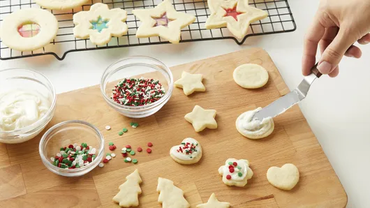 On separate ungreased cookie sheet, place small center cutouts. Bake 4 to 6 minutes or until light golden brown. Cool 2 minutes; remove to cooling rack to cool completely.